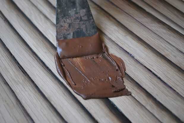 Con una masilla para madera de relacionados/MEK, diluye la mezcla con relacionados y aplica una capa sobre el tablero entero. Los compuestos/masillas con base de petróleo, suelen ser demasiado espesos, y toman demasiado tiempo para secar. Comprueba el color de la masilla antes de aplicarla al tablero. El color final será más claro es al principio.