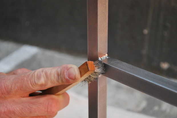 Molí las uniones interiores para aplanarlas, pero no toqué las costuras soldadas exteriores, para resaltarlas. Con un cepillo de cerdas de alambre, quité la decoloración de las soldaduras, y fregué el resto del acero con un cojín áspero. El acero tiene se ve bien--industrial pero todavía refinado y artesanal.