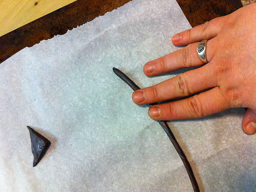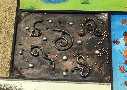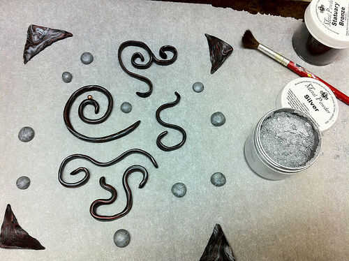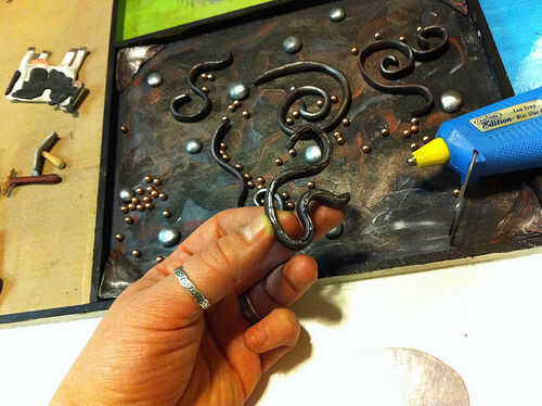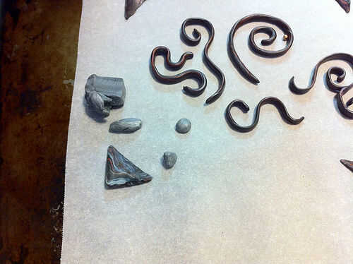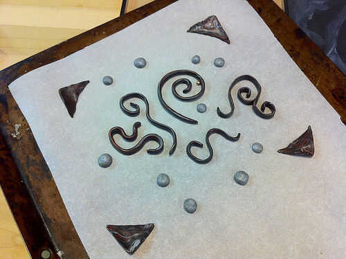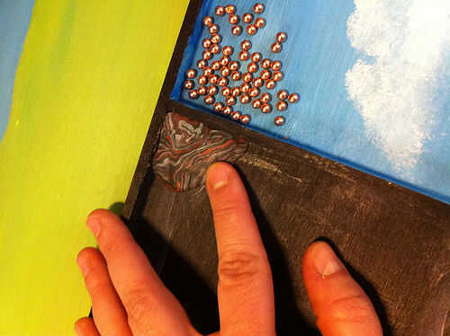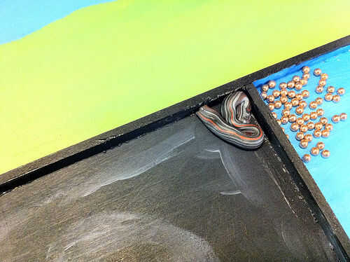 La sección de pintura de un color oscuro y en algunas franjas de otros colores. Estirar algunos arcilla del polímero en los colores de su elección y la forma en espirales y ondulaciones. Asegúrese de que son menos altos que el marco de madera. También he añadido las esquinas pendiente de arcilla, pero no tienes que. Hacer algunas bolas aplanadas de la arcilla polimérica para añadir un poco más de interés para el laberinto, si lo desea.