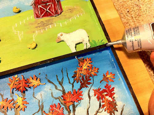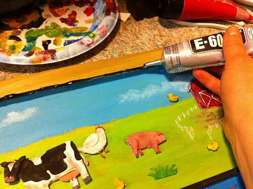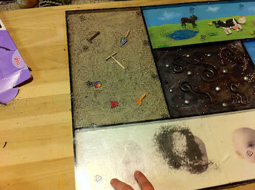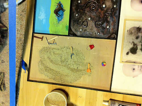 Asegúrese de que la estructura de madera se pinta como quiere. Añadir los elementos a la estructura si no lo has hecho ya. Ponga que las hojas boca arriba si no son doble cara. Añadir la arena y las herramientas. Añadir las bolas de metal y cuentas de plástico. Añadir los animales de corral. Añadir las limaduras de hierro.