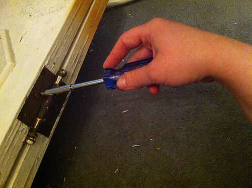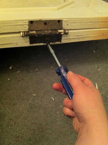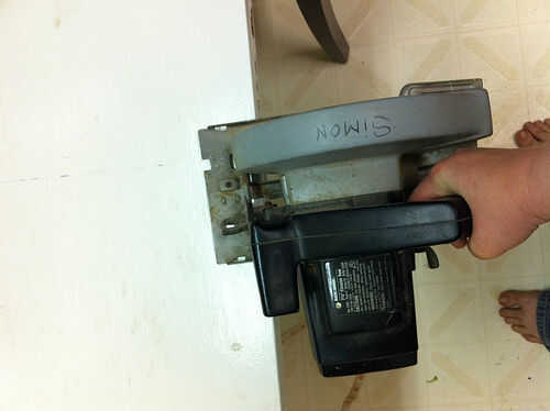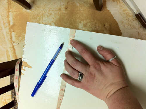 He quitado las bisagras y apoyado una sección de la puerta en dos sillas, así que pude hacer algunos cortes con la sierra circular que Josh heredado de su abuelo. Voy a intentar explicar las medidas de las piezas que cortar en relación a la mesa.