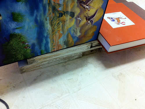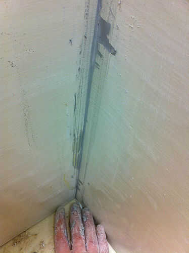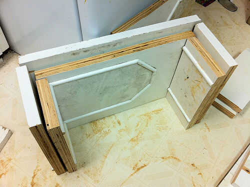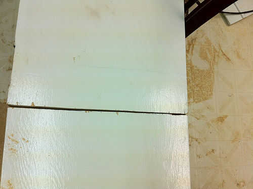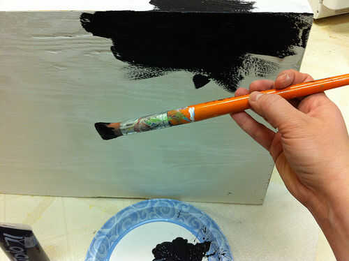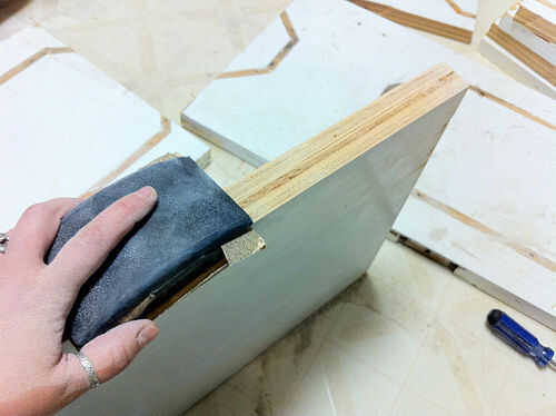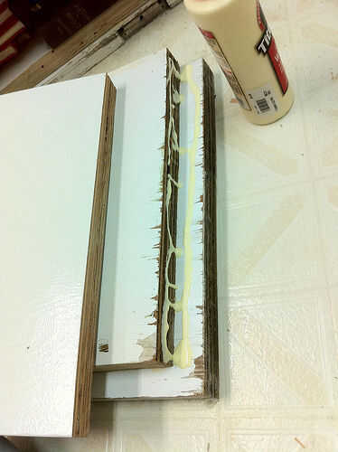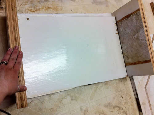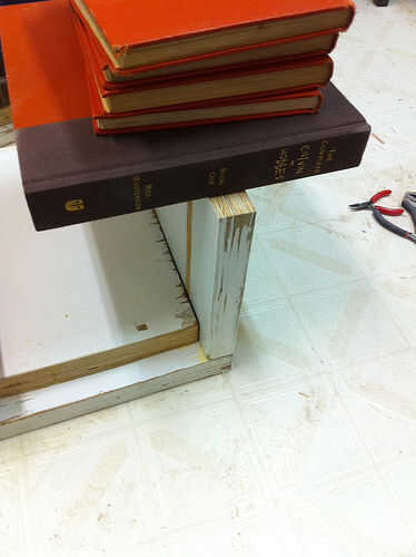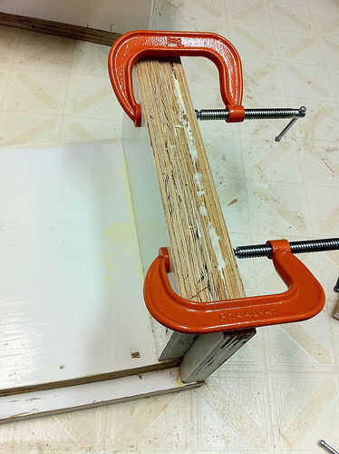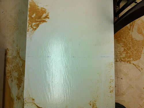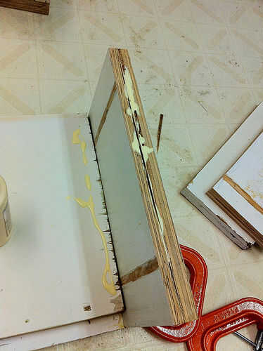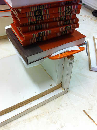 Después de que el pegamento ha permitido sentarse durante horas, quité los libros y las abrazaderas. Tuve algunos yeso sobrante de un proyecto de cuarto de baño y aplicado finamente para sellar los espacios de los extremos cortados de la madera contrachapada y algunas costuras imperfectas en las piernas. Después de el yeso seque durante la noche, lo había enarenado y había pintado ambas piernas con pintura acrílica negra. Necesita una pareja capas en algunas áreas.