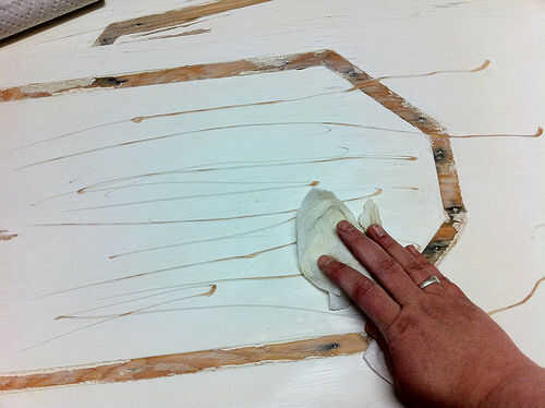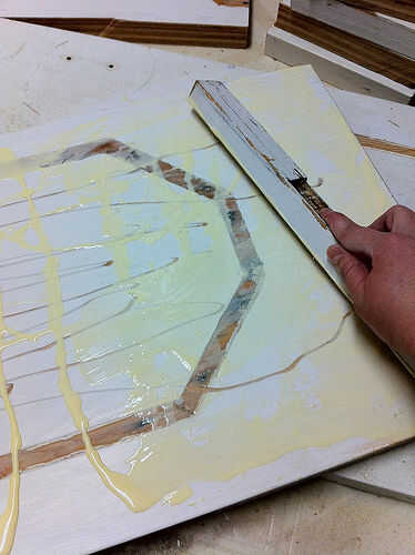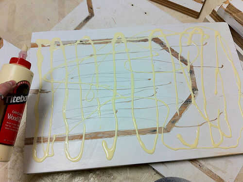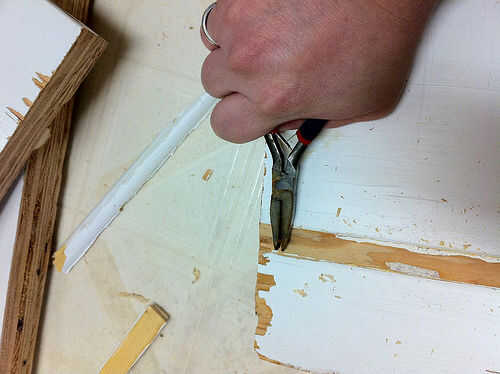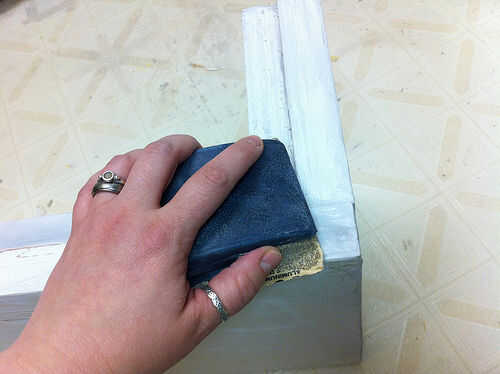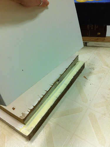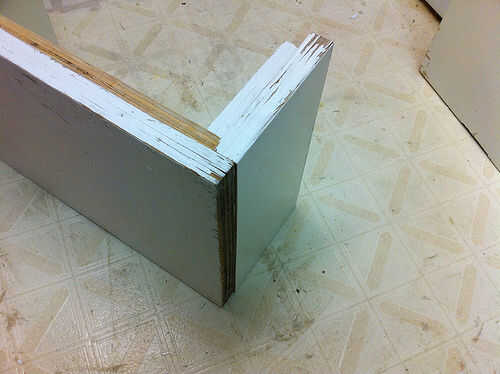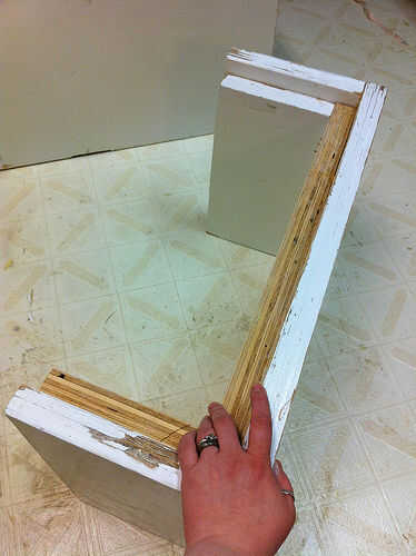 Yo oró hasta la moldura decorativa y sacó las uñas poco. Lijar todos los bordes y algunos de la pintura con el fin de unir las piezas. Aplica pegamento de madera a un lado plano de una pieza B, extenderlo bien y presionado contra una parte plana de la pieza A, asegurándose de que los fondos fueron alineados los lados de la pieza B se centraron entre los lados de la pieza mayor A y el borde superior de la pieza B era grueso de una mesa debajo del borde superior de la pieza A. Apilar algunos libros pesados sobre la pieza B porque es más fácil que intentar fijarlo con la abrazadera y dejar reposar durante unas horas.
