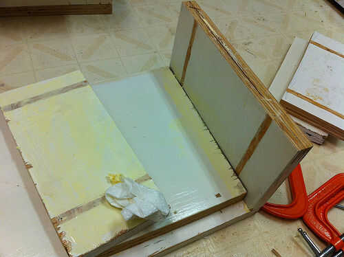 Tomé una pieza C y aplicar pegamento para madera a uno de los bordes laterales, separarse completamente. Presiona el lado pegado a la pieza A, derecho donde confinó pieza B por un lado. Cuidadosamente de equilibrado algunos libros sobre él mientras Unte pegamento en un lado plano y un borde largo de una pieza D. He pulsado el lado plano pegado de la pieza D contra el lado plano del interior de la pieza C, mientras que el borde largo pegado fue presionado en pieza B. Me aseguré que la parte superior y borde inferior de la pieza D alineado con el borde superior e inferior de la pieza B. En este cuadro, pieza C tiene algunas grietas en la madera, así que añadido algunos pegamento de madera antes de fijación pieza C y D de la pieza juntos. Ángulo de las pinzas así que pude descansar a un montón de libros encima, presionando las piezas C y D en trozos A y B.
