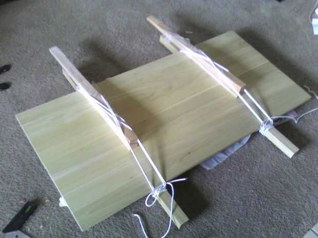 Coloca cuñas envuelto en papel encerado encima de la mesa, directamente sobre las piezas de la parte inferior de madera. Él envuelto algunos de cuerda de nylon firmemente sobre la mesa y alrededor de los extremos de las piezas de la parte inferior de la madera en forma de ocho con las cuerdas superpuestas sobre las cuñas como se muestra. Hemos aprovechado en los extremos de las cuñas (no los extremos puntiagudos) corto, planos con un martillo para empujar más fuertemente. Algunas personas usan el plano trozos de madera a la derecha debajo de las cuñas, pero no tenía ganas de él.