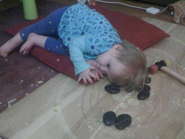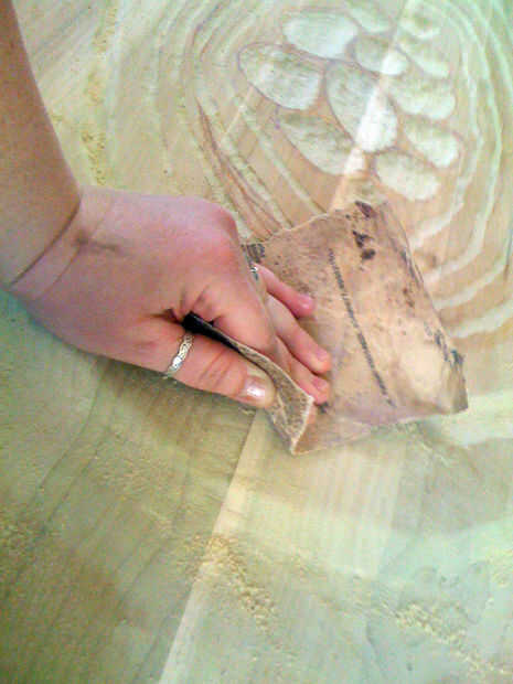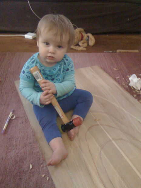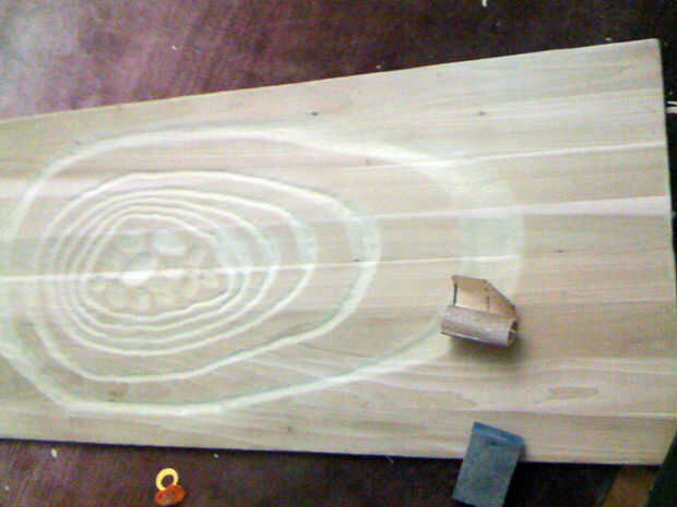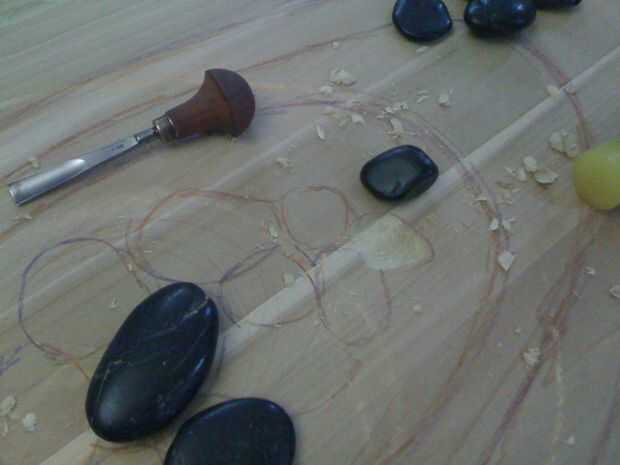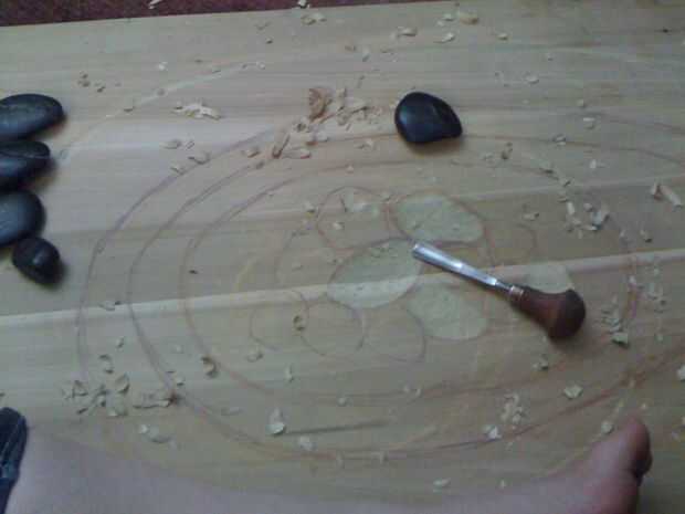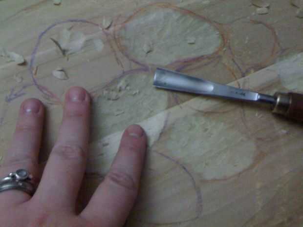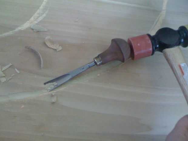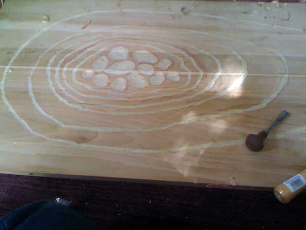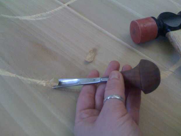 Comencé por talla de los anillos, golpeando la gubia a través de la madera con martillo de traste de Josh (pasó a ser el primer martillo cogí). Esto tuvo una buena cantidad de tiempo. Tuve cuidado de no tratar de cavar muy profundo a la vez la gubia y dividir la madera.