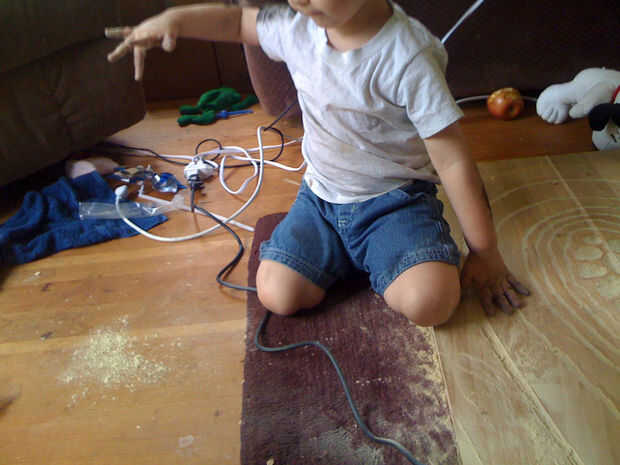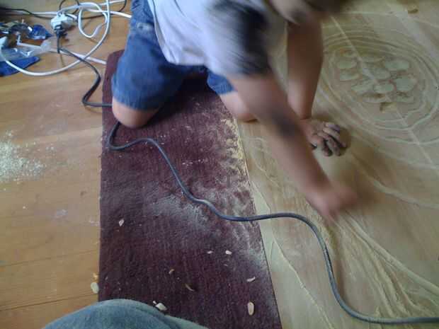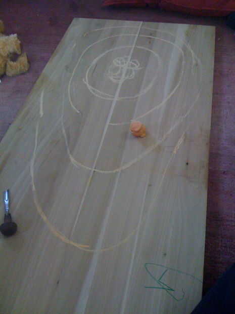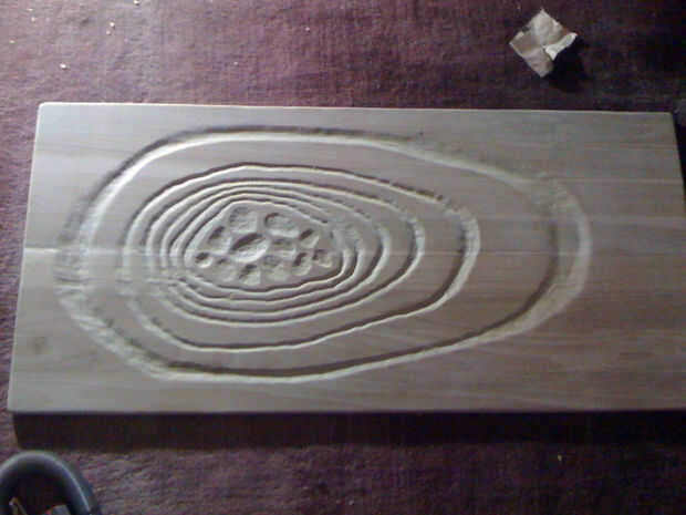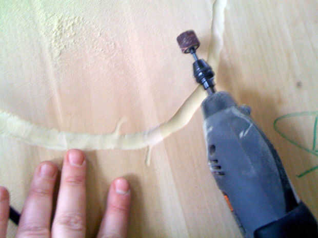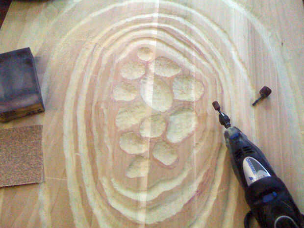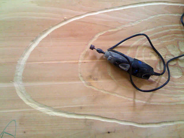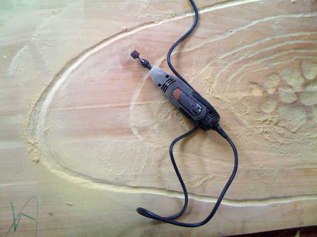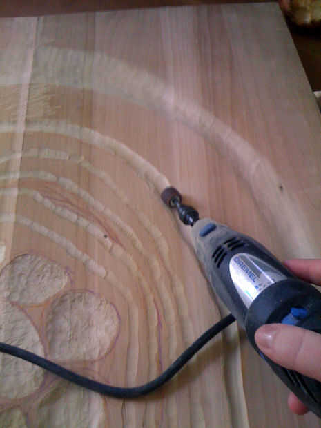 Después de algún tiempo, yo alternaba utilizando la dremel para tallar los anillos más amplias y profundos. Quería la tabla para ver un poco áspera, así que no preocuparse demasiado por poco errores cuando la dremel girar fuera de la ranura que estaba tallando. Usando el dremel ha creado una gran cantidad de polvo y aspira a menudo.