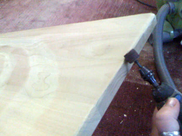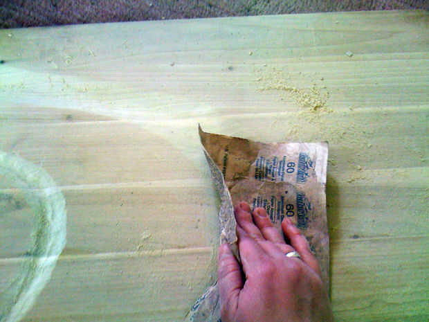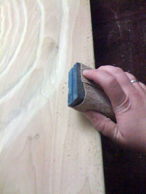 Yo no tenía ninguna herramienta eléctrica a la arena de la tabla, por lo que había lijado a mano, trabajando mi camino a través de los granos de 60 a 220. He dejado algunos arañazos más grandes con los granos de inferiores, suavizar los bordes de los arañazos profundos con los granos mucho más alto. Lo hice porque yo quería que se vea más viejo y gastado, pero no lo quiero sentir áspera o irritada.