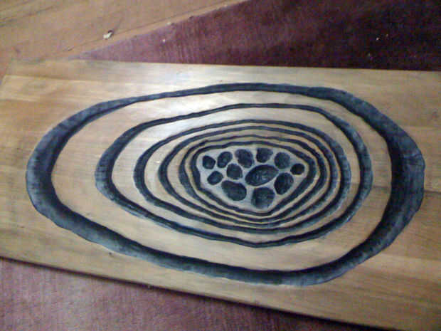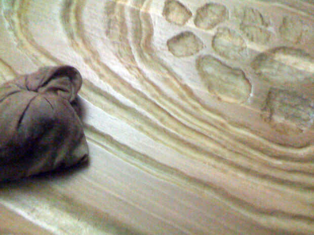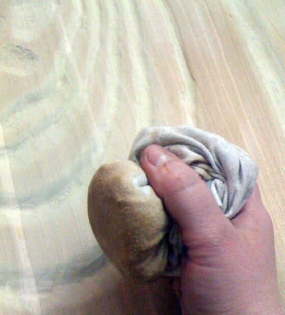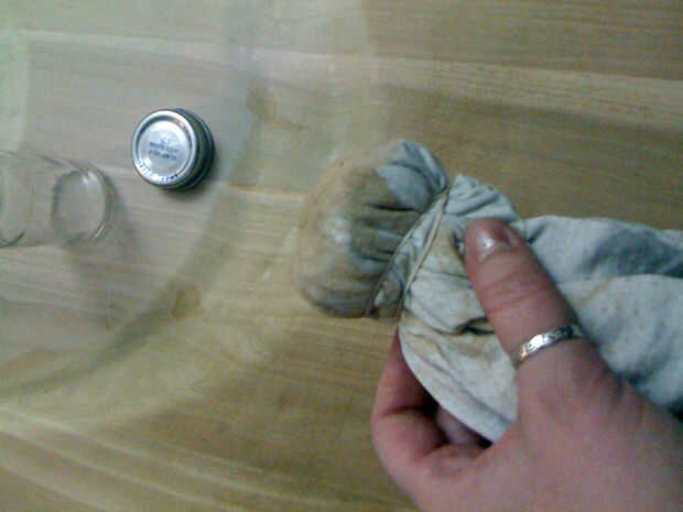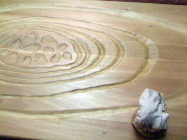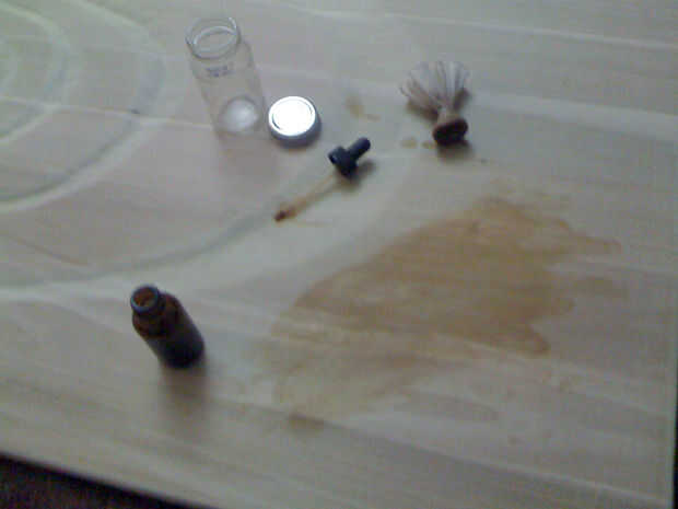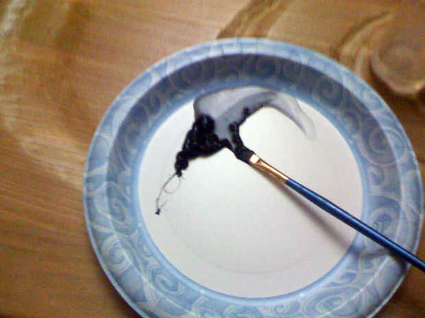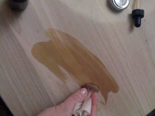 El cojín poco que usamos anillos de madera de la laca era demasiado pequeño, así que alagodón uno de viejas camisetas de mi niño, asegurados firmemente con una banda elástica y utiliza para aplicar la laca. Se seca bastante rápidamente. Me aplica unas capas luego agregar aceite de oliva en el plato. Ayudó a que la almohadilla no se pegue. Luego aplica la última capa y sacó la pintura para el siguiente paso.