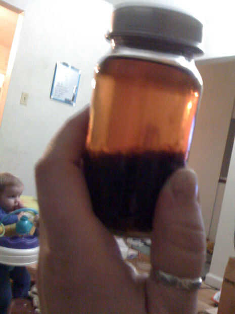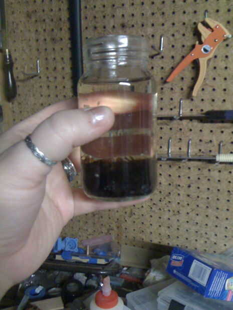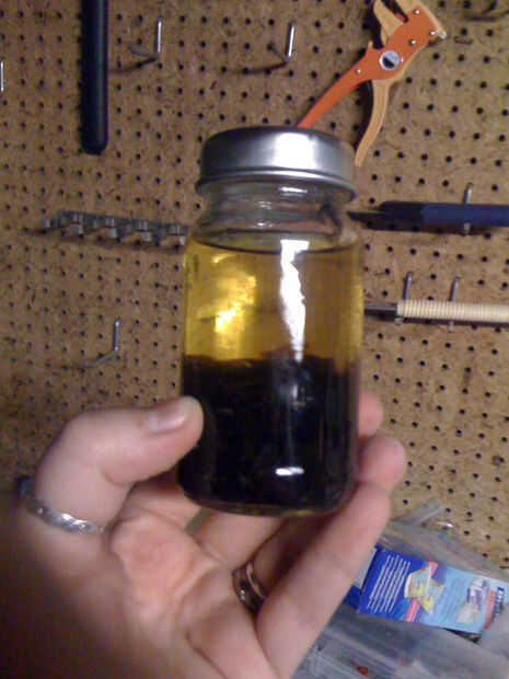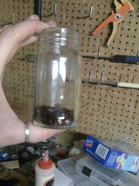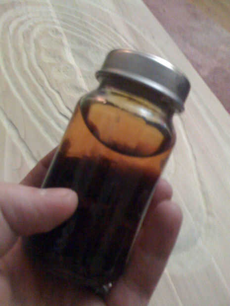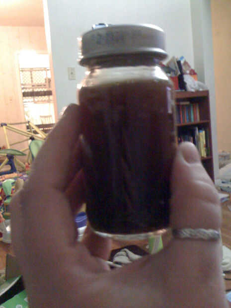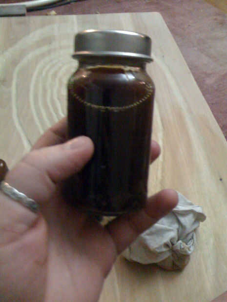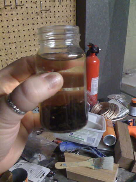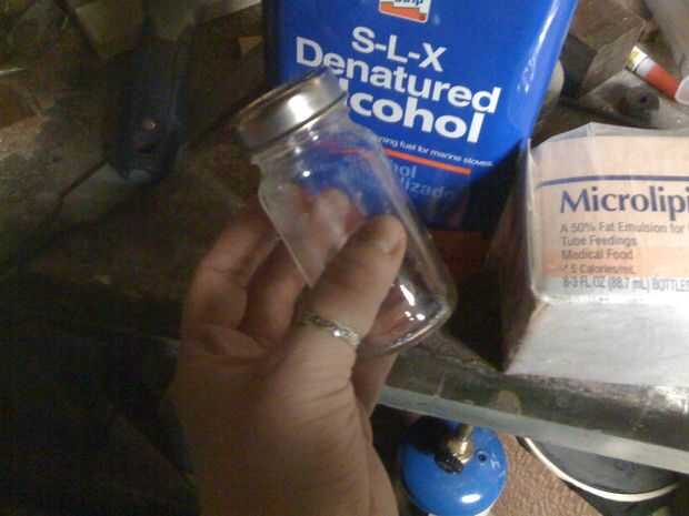 Poner unas escamas de goma laca en un recipiente, luego agregar alcohol desnaturalizado. Sacudí la jarra cada pocos minutos hasta que las escamas se disuelven completamente. Creo que esto tuvo un par de horas. Josh dijo sería durante la noche, pero sacudiendo aceleró. Yo estaba impaciente.