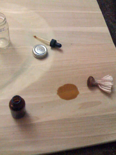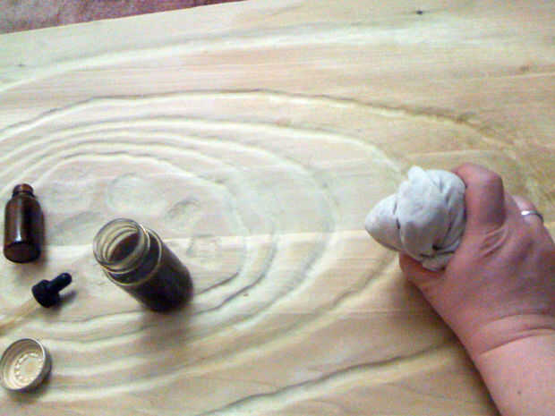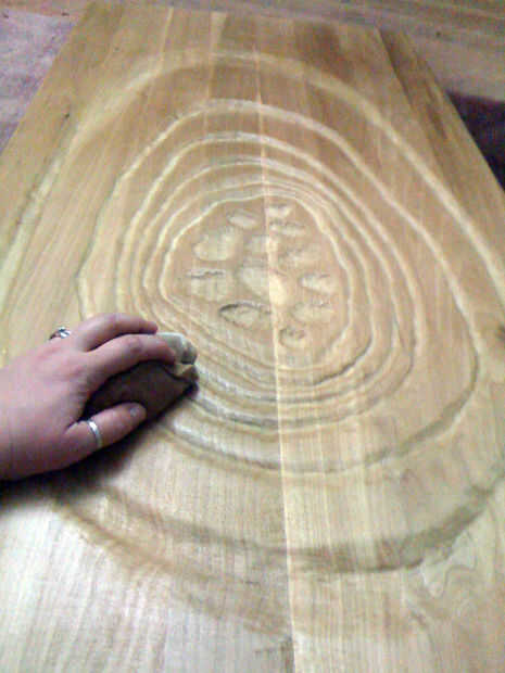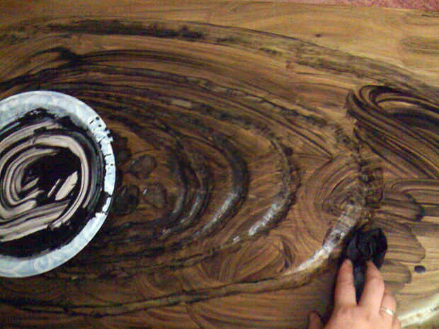 Quería anillos oscuros de mucho contraste. Quería la tabla para ver un poco más mayores, así que primero hice una pintura lavado en los arañazos que había dejado mientras lija. Mezclé agua y pintura de acrílico negro de partes iguales. Limpiar sobre la mesa todo luego limpiada lo nuevo con una toalla de papel húmeda.