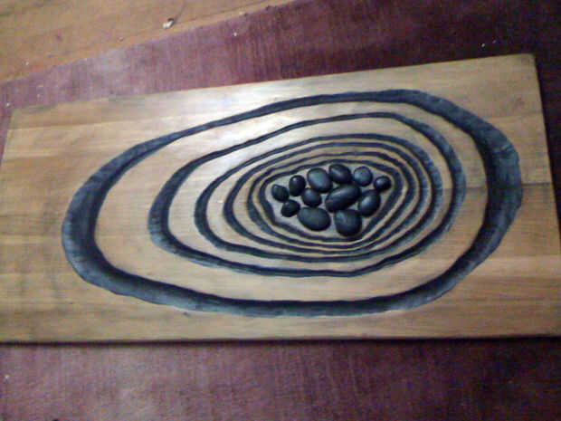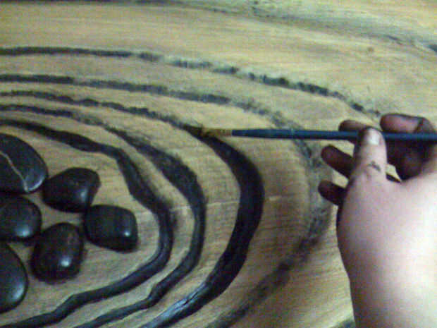 Después de que fuera seco, tomé un pincel y pintado en los anillos y los huecos donde descansaría las piedras con pintura acrílica negra sin diluir. Poner las piedras en los huecos después de que la pintura estaba seca solo para ver cómo se vería la tabla terminada, pero no pegarlos en. No quiero pegar hasta que había terminado el otro lado de la mesa porque quería la mesa en posición horizontal mientras trabajaba en él.