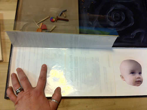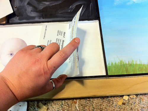 Todo lo que utilizas, adorno para colocar y pegar en su lugar. Probablemente usted tendrá que agregar el pegamento de silicona a los bordes Si utilizas acetato. Sería malo conseguir limaduras de hierro en el acetato.