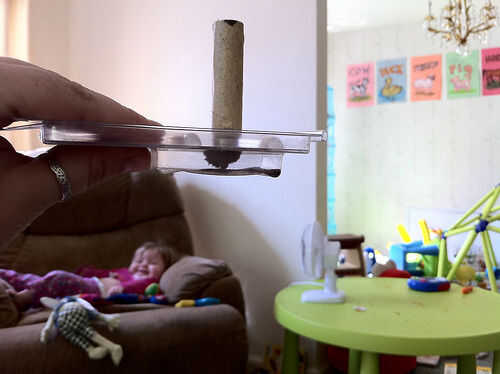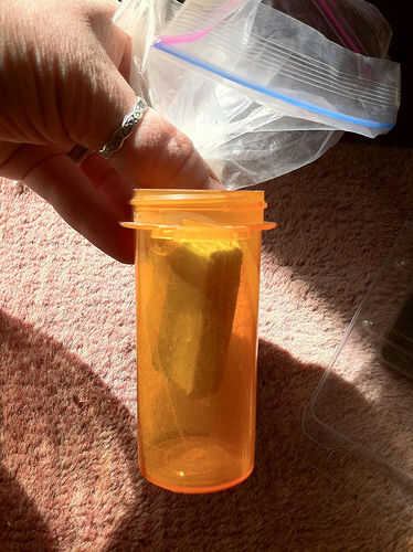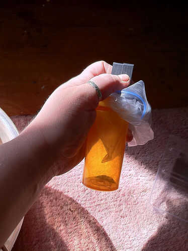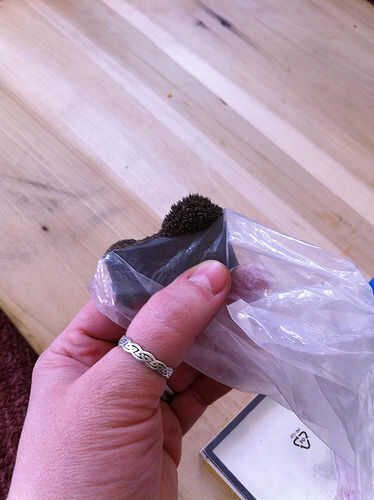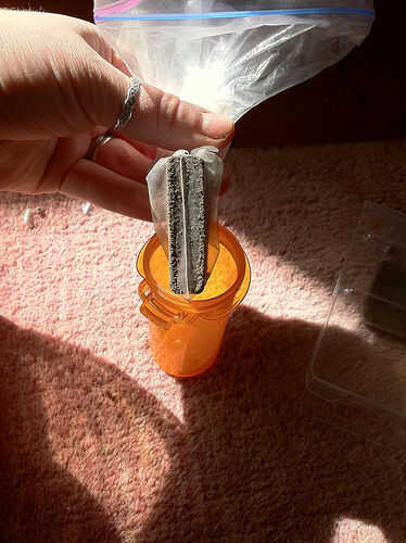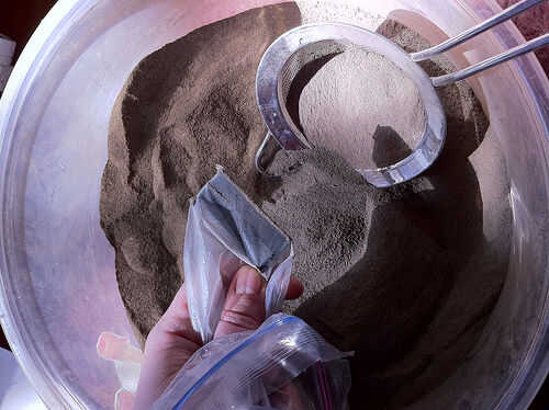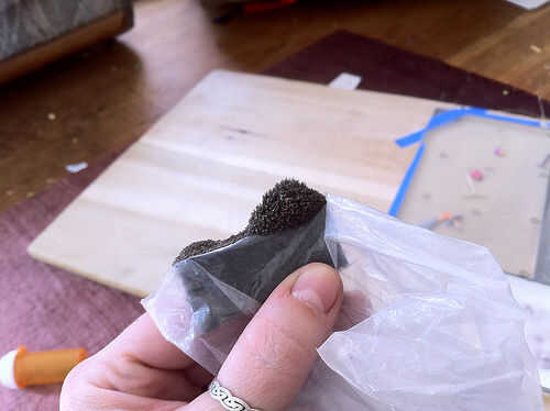 Sería más simple comprar limaduras de hierro, pero se olvidó de pedir algunas y no encontrar ninguna en la ciudad (no tengo tiempo para conducir en busca de cosas). Afortunadamente, el suelo de nuestro patio parece tener altas cantidades de hierro. Ya tenía un montón de suciedad fina cernida que Josh estaba usando para hacer un dorodango. Coloco dos imanes de la barra en una bolsa de plástico y suciedad espolvoreada sobre él hasta una cantidad justa pegado al imán. Luego puse la bolsa de plástico, imán y rico suelo de hierro en un recipiente plástico pequeño con tapa. Sostenía la bolsa de plástico dentro del contenedor mientras tira el imán de la bolsa. El suelo rico de hierro cayó de la bolsa en el contenedor. Sacó la bolsa y repite el proceso un par de veces. Yo sabía que era todavía un poco de tierra mezclado con la plancha que recopilé, usé el imán a lo. He presionado el imán contra el lado del recipiente, ponérselo la tapa y lo sacudió. Las partículas de hierro se aferraban al lado del contenedor contra el imán mientras que los bits sin mucho hierro cayeron en la parte inferior. Mantuve el imán presionado firmemente contra el lado del recipiente mientras que cuidadosamente retirando la tapa y luego verter hacia fuera la suciedad que no estaba pegada al imán. Repetí el tamizar varias veces para asegurarse de que el hierro era tan puro como podría conseguir.