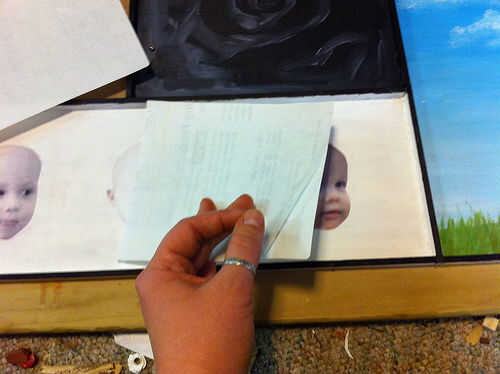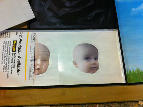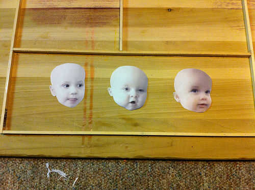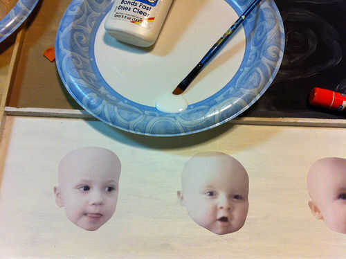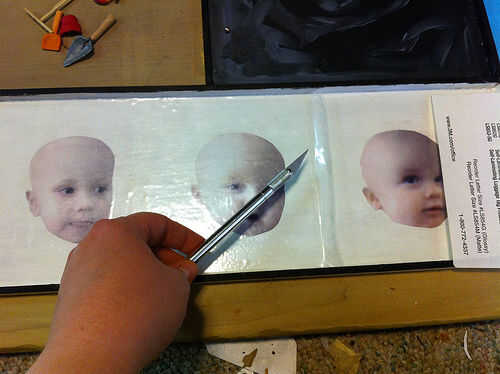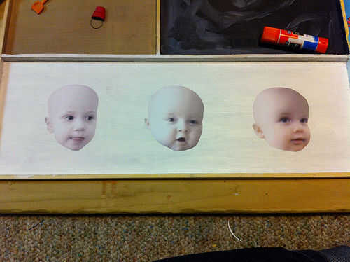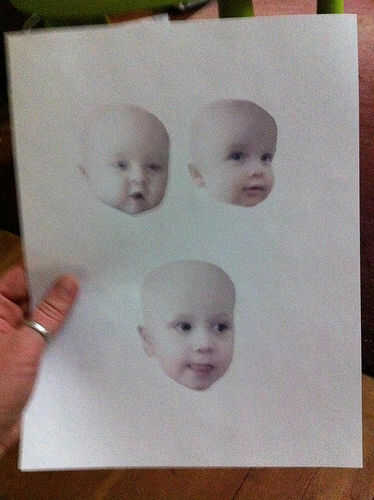 Mis hijos no son calvos. Josh me ayudó a usar el Photoshop para que se vean calvas, aunque. Imprimí fotos de sus caras y recorto.