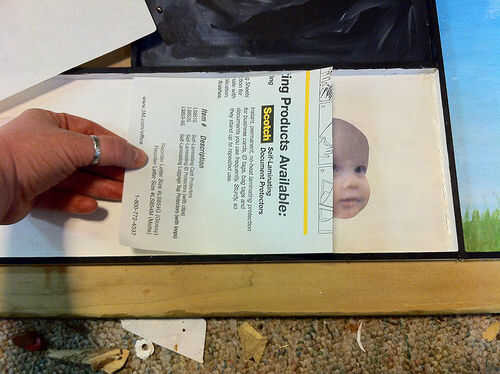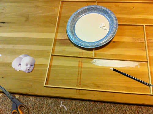 He añadido pegamento blanco a la parte superior de sus caras, pero esto era probablemente innecesario porque cubrí con película transparente. Yo no tenía acetato y no pudo encontrar la hoja de tamaño adecuado en la ciudad, así que utilicé la parte pegajosa de un par ser laminado en hojas.