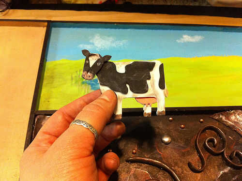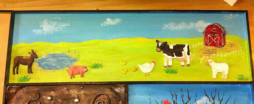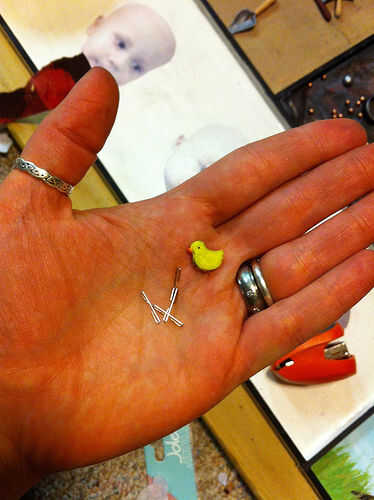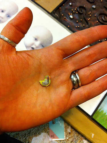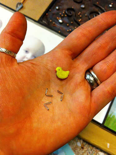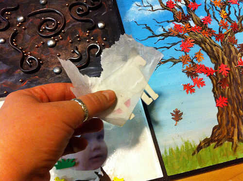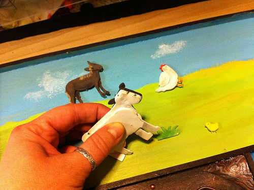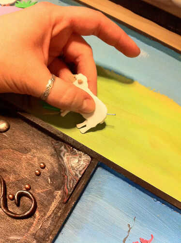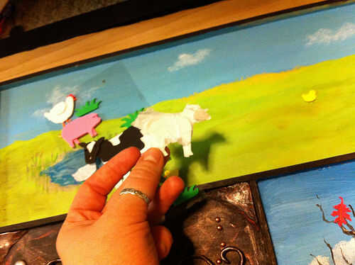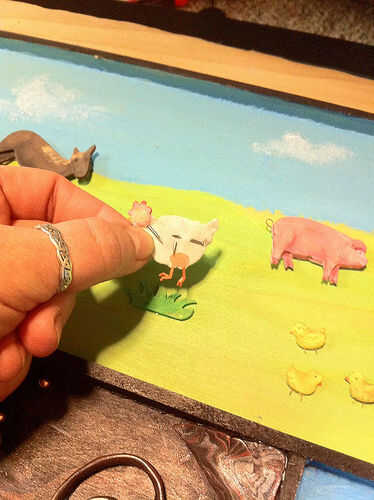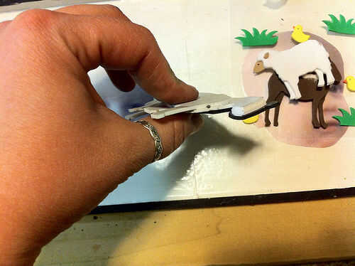 Yo estaba cansado y no quería cortar formas de animales, así que compré unas pegatinas de animales. Eran pegajosos en la parte posterior, por lo que pegué a un papel tenía y rasgó lejos el exceso. He insertado pequeños clavos en los animales, asegurándose de que no eran demasiado visibles desde la parte superior. Los polluelos del bebé eran demasiado pequeños para las uñas, así que había doblado algunas grapas y había pegado a la espalda de los pollos en vez de usar una pistola de pegamento. Dos grapas era suficiente metal para el imán sacar los polluelos alrededor bajo el plástico.