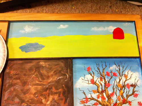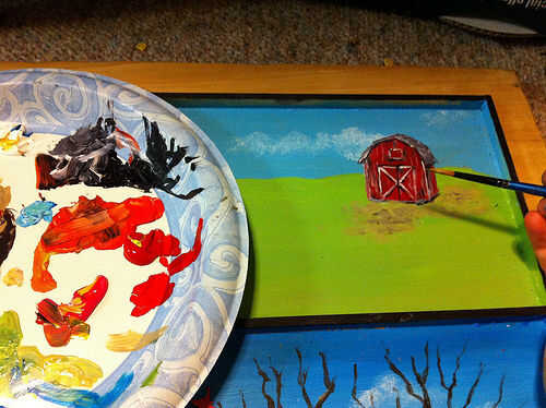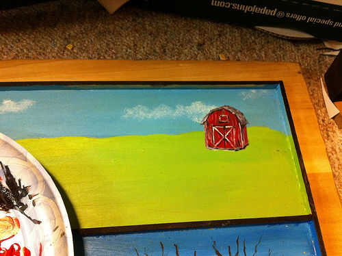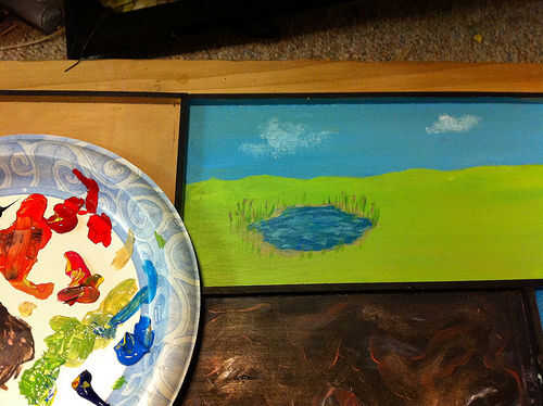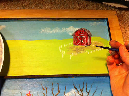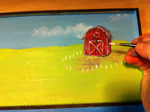 Pintar un cielo azul, nubes blancas y verdes colinas. Agregar otros detalles si lo desea; un granero, una cerca y un estanque de los patos pueden agregar interés.
