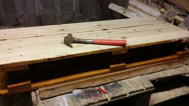 Una vez que el pegamento se haya secado, uñas las secciones a los bloques debajo de ellos. Puede poner los clavos a través de la parte superior de las paletas o los huecos en la madera y luego los golpee hacia abajo con el cincel. Opté por esta última ya que reduce el número de clavos en la tapa de tabla.