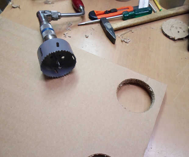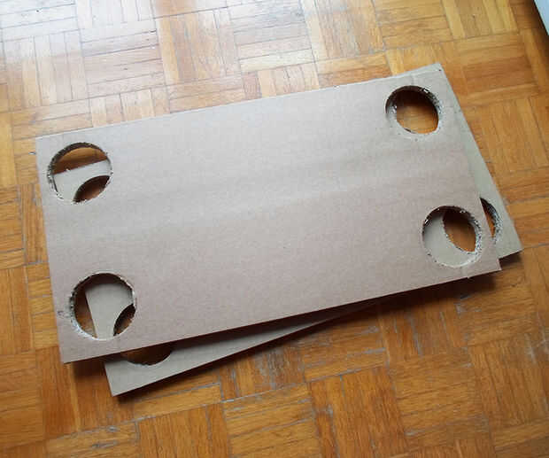 Use un cortador del agujero y el taladro para hacer los agujeros para las patas de ambos rectángulos.