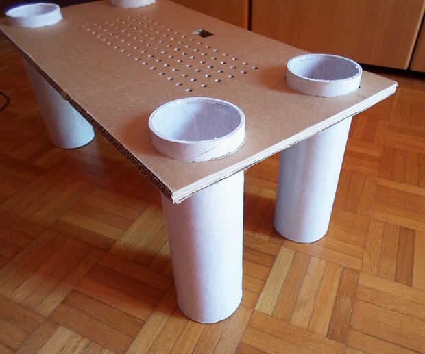 A continuación, la tabla en los pies y presione hacia abajo la cartulina un poco más, dejando alrededor de 1, 5cm (0,59 pulgadas) libre de la parte superior de los tubos.