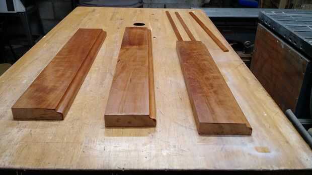 Corté un montón de cereza que la moldura. fue una tarea porque todo me quedaba era el corte offs con clavo agujeros y nudos... el contramarco es 7/8 '' de espesor y altura de 3.5'' y ejecutar a través del router con un poco de borde de tabla... el frente del cajón fue cortado a la medida y cubierto con el trapo en poly (lustre) era un trozo inservible de madera porque era el crouch de dos miembros... pero se ve bien como frentes de los cajones...