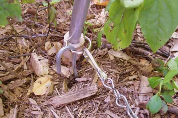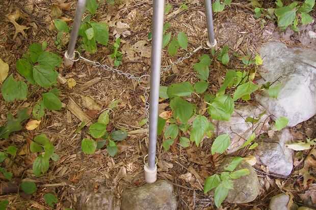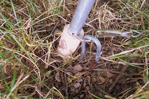 Empuje las estacas de la carpa en el suelo enganchar los anillos de división para las tres patas de anclaje.
