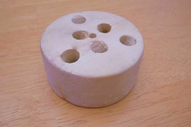 3. Voltee el bloque y repetir otro 3 agujeros de perforación. Estos agujeros deben compensarse entre los agujeros perforados de la parte superior.