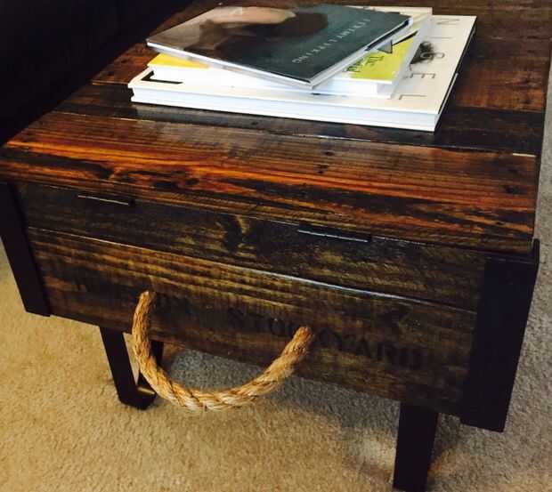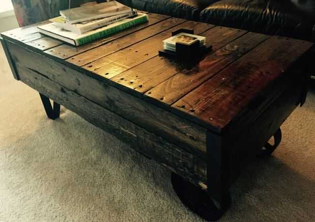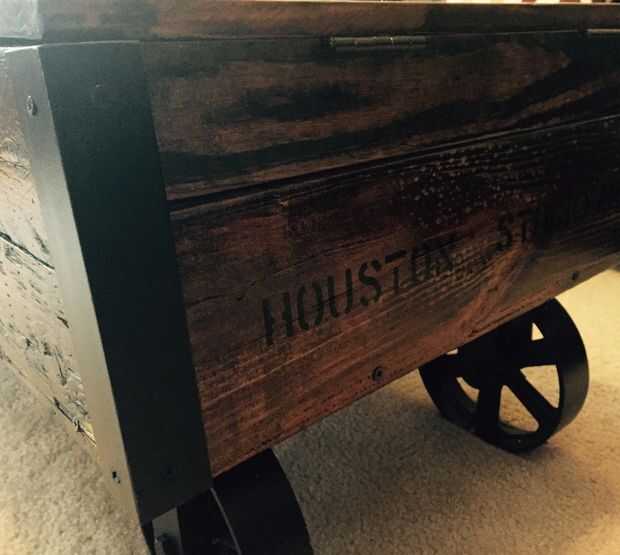 Después de hablar con mi amigo y obtener su entrada sobre las características que le gustaría que la mesa que. Sólo tenía dos requisitos: un industrial ver y hacer tus cosas (lo quería). Decidí ir con un look industrial carro viejos hecho con palets viejos. Pensé que esta mesa de café podría duplicarse como almacenamiento para algunos de sus materiales de arte. Luego mediante la adición de las ruedas y un mango esta mesa de centro se convierte en una maleta improvisada mientras que él va a una de sus exposiciones de arte.