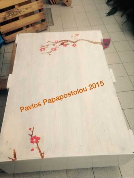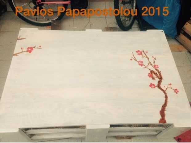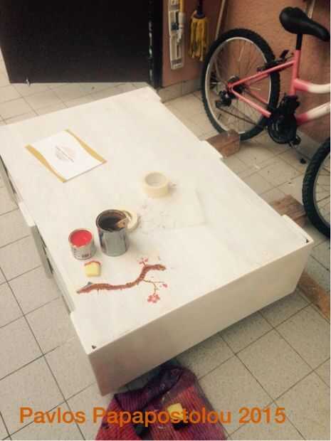 Luego con la ayuda de una esponja pintó. Después del secado he aplicado 3 capas de barniz transparente a base de agua para proteger la parte superior y dos capas del mismo material en el resto de la tabla. (lote de pintura y largo tiempo de espera.