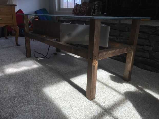 Atornillar y encolar los travesaños a las patas, a una distancia desde la parte superior que es un poco más que la altura de la luz encima del signo de flecha. Por ejemplo, si mi flecha es de 6" de alto, tornillo los travesaños en las patas 6 1/2" hacia abajo desde la parte superior que es la señal para sentarse encima de los travesaños y todavía caben bajo el vidrio.