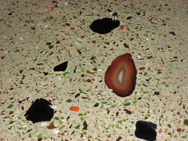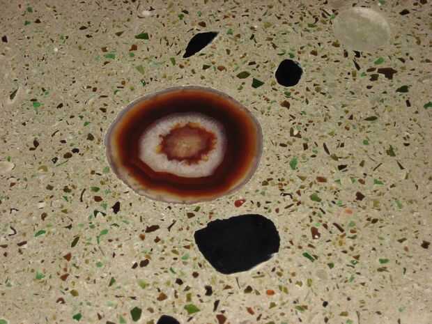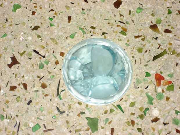 El agregado de vidrio es hermoso y las rebanadas de la ágata resultaron gran, una gran mejora sobre almacenarlos durante años en una caja en mi garage, pero tal vez la sorpresa más interesante fue lo que pasó con las lentes de proyector. El hormigón había agrietado les como conjunto, sino que todas las piezas en lugar firmemente, por lo que se parecen a tipo de dividir las células. Después de secado, había sellado de la superficie con un sellador de lechada de aerosol y había pulido con una capa de Howard Feed-N-Wax. Hasta ahora ha mantenido un gran acabado y ha sido bastante resistentes a las mancha.