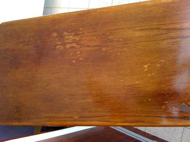 Tenía que trabajar en la superficie de la mesa porque es un poco irregular (no deje platos calientes o líquidos en una mesa de madera...) así que lo primero fue lijar la mesa usando una lijadora orbital.