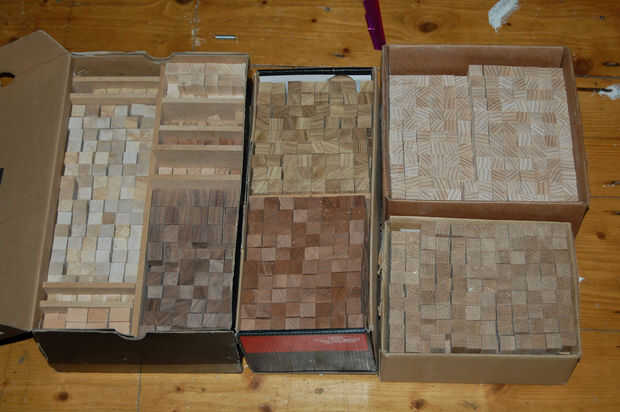 Mis pixeles eran 15 mm x 15 mm y alrededor de 20mm de profundidad. Ya tenía una caja de zapatos bastante bien surtido debido a Mis Escapadas de tablero para picar, pero con más de 1500 necesario tuve que hacer más.
