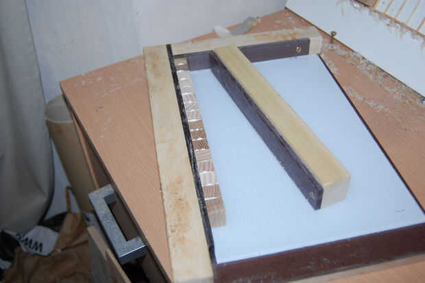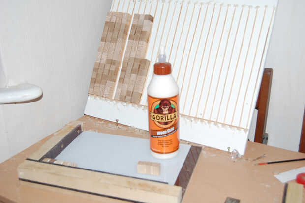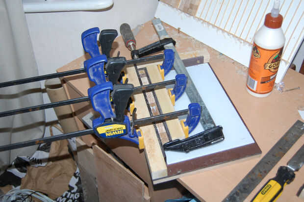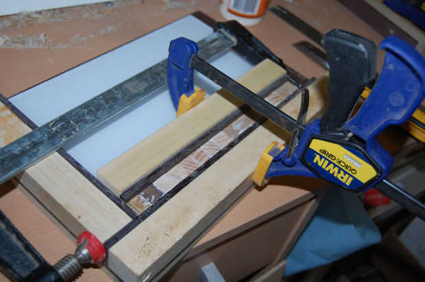 Hice un vídeo para mostrar este paso por lo que voy a dejar que hablen, pero básicamente pega una fila a la vez ser cuidado de mantener la Plaza cosas y plana bajo la fuerza de las abrazaderas. Después de cada fila limpiar exceso pegamento del borde con un cincel hasta la siguiente fila se sentará bien a su lado.