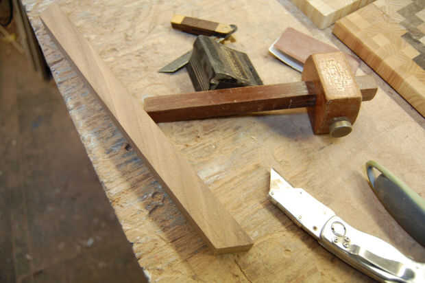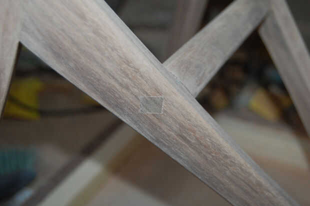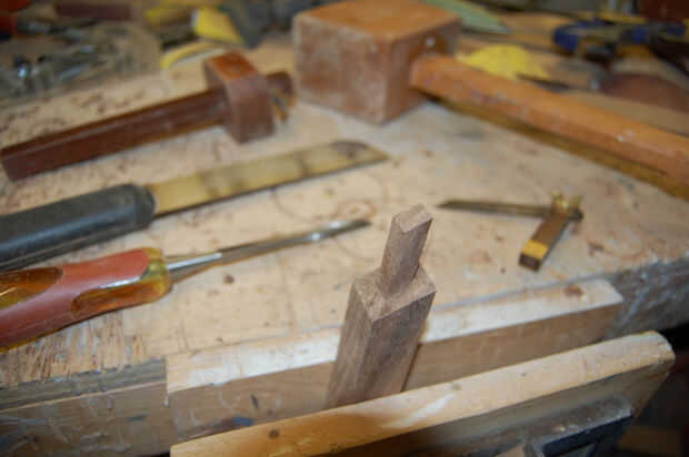 Las espigas se hicieron tira la sierra y cincel. Me olvidé de la foto, sino para cortar el mortices en las piernas, he usado mi fresadora con una cuña de 30o.