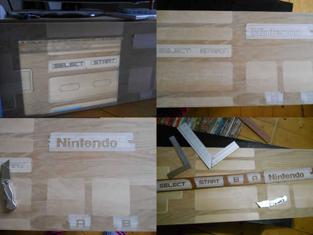 Entonces trazó alrededor de las palabras proyectadas con un lápiz y cortar la cinta para marcar las letras en el roble.