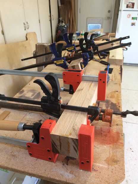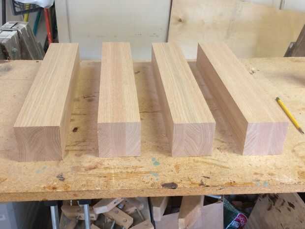 Hay muchas maneras para hacer las piernas. Me decidí a los laminados. Esto es cuando usted toma pedazos y pegarlos juntos y hace una pieza más grande. Esto hace que una pierna muy sólida. Tomé 3 piezas son 1" espesor y muy plano después de que corrió a través de la cepilladora y había pegado juntos haciendo cuadrada patas de 3". Para hacer esto correctamente la madera debe ser muy plana y tiene un montón de pinzas para ejercer presión. Cuando se seca se corrieron a través de sierra y garlopa para hacer agradable limpio buscando pedazos sólidos incluso no puedes decir que se pegan.