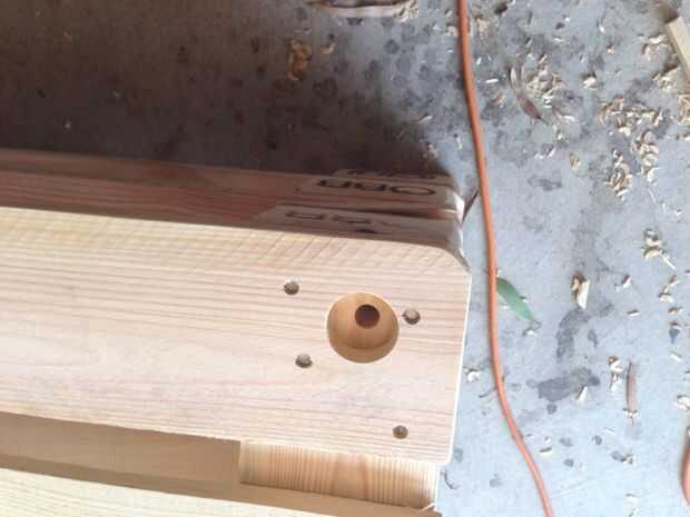 En su plataforma superior. Línea de corte con cada agujero de la llave y poco. Crear una marca de perforación a través del orificio de corte apagado en su plataforma superior. Ahora tienes tus marcas para cada agujero que se creará. Retire la cortada y luego seguir perforando, siempre tan lentamente hacia abajo hasta tu agujero VI comienza a moverse libremente. Esto significa que sacar a la pieza superior de la madera para cada orificio y eso es todo que es necesario taladro para la arandela y la tuerca de la hendidura. Esto también significa no cincelado y un mucho más agradable, más suave y recta mirado agujero que en la parte inferior! ¡ Mira la foto!