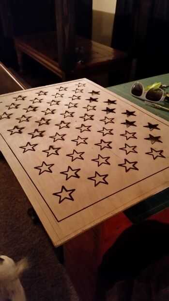 Originalmente, el plan era que el patrón de estrella cortar con un cortador láser. El problema era que el pegamento en la madera contrachapada impide que el laser pudiendo llegar hasta la madera. Salió un buen patrón a seguir tan resultó ok. Usé un cuchillo del exacto para terminar cortando el último poco a través de. Esto demasiado tiempo. Esperar que tome varias horas. ADVERTENCIA: tenga cuidado de cortar las estrellas. Terminé mi dedo de corte bastante profundo en el proceso. Una vez más, tenga cuidado. Cuando todo es cortar, pintar las estrellas azules.