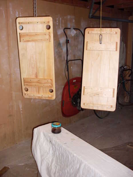 -Colgar los estantes del techo en mi taller para que sea fácil de aplicar acabado a ambos lados de las estanterías al mismo tiempo.
