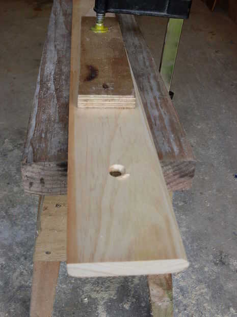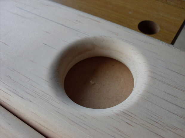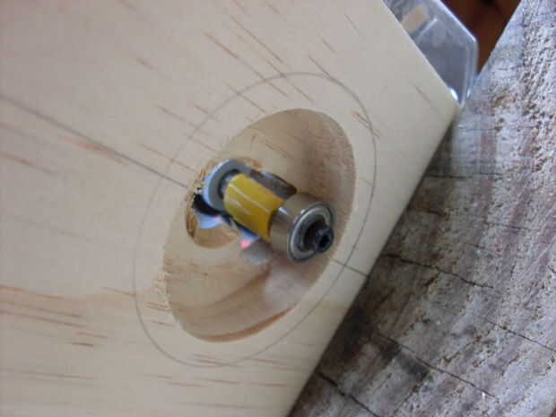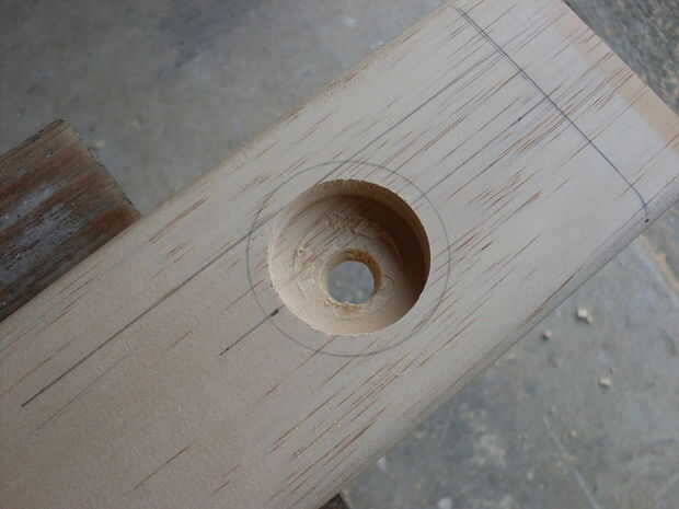 Mi broca no fue tiempo suficiente para hacer toda la profundidad de la madera, así que terminé con una cavidad circular perfectamente con fondo cuadrado. I las tablas de la vuelta, perforar un gran agujero en el centro de la cavidad y usa una broca de recorte al ras para terminar el resto de la profundidad del agujero.