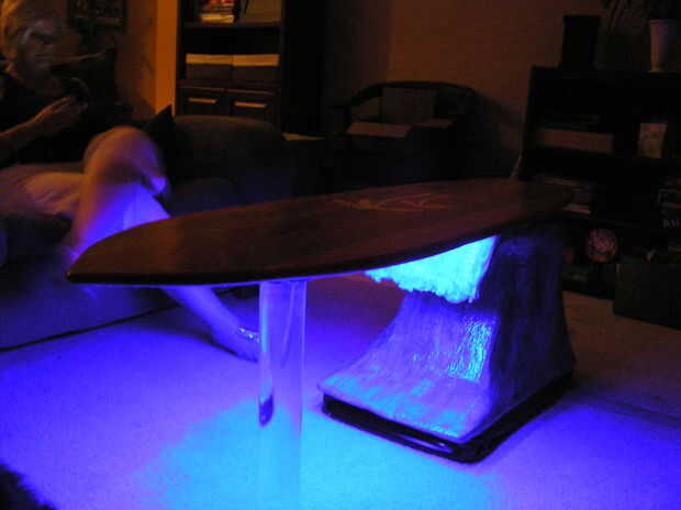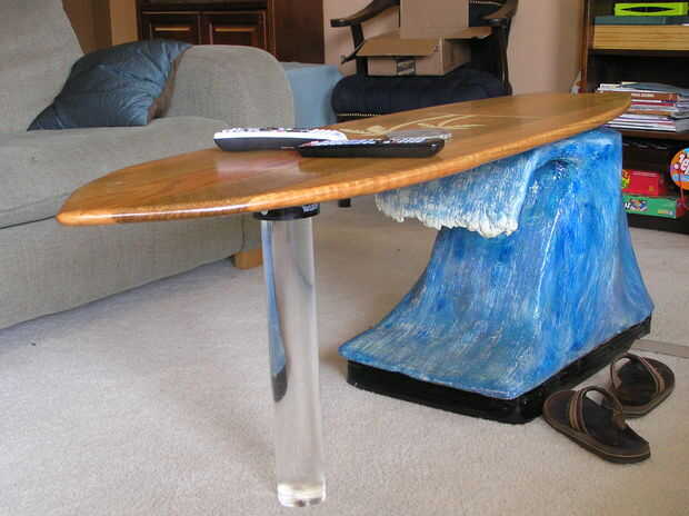 Mesa de centro que es una tabla de surf del sofá-longitud cabalgando sobre una ola.