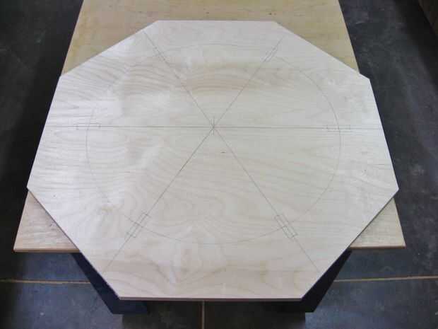 Comencé trazando la señal en unos 3/4" muebles abedul contrachapada. El centro se encontró dibujando líneas en el diseño, conectar todas las esquinas.
