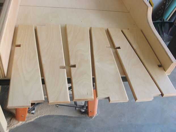 La madera fue terminada con tres capas de rociador en laca. Después de cada capa, todas las piezas fueron enarenadas ligeramente a mano con lija de grano 220.