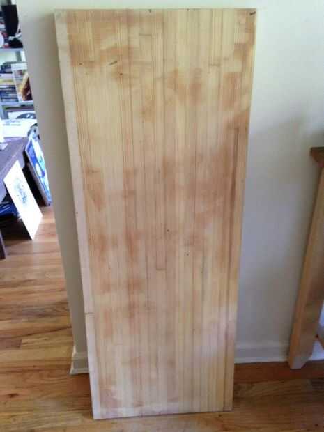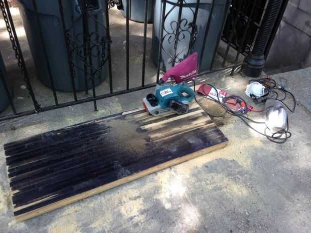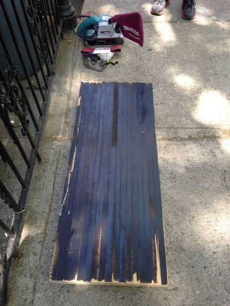 La parte superior de la pista de bolera está aglutinada con años de acabado, suciedad, porquería, no sé qué más. El fondo está lleno de pintura negra bruta. Para extraer estas cosas se necesitan una lijadora de banda y un papel de lija muy áspero. Menor el número de grano, el más áspero es el papel. Yo alquilar una lijadora de banda de Red gancho Home Depot y compró papel grano 50 para él.