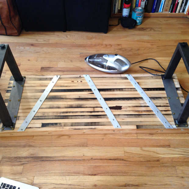 Lo que hace única a callejón de bowling lanes es que las tiras de madera no se realmente siguen juntos muy bien ya que normalmente sólo se sientan en el piso. Uñas sosténgalos juntos. Si no asegurar las barras entonces con el tiempo la tabla se combará hacia el centro. Los otros dos blogueros seguí utilizan un router y una barra de aluminio cuadrado. Un router es un instrumento de alimentación adicional que no tengo la habilidad de usar, así que decidí poner las barras sin un router.