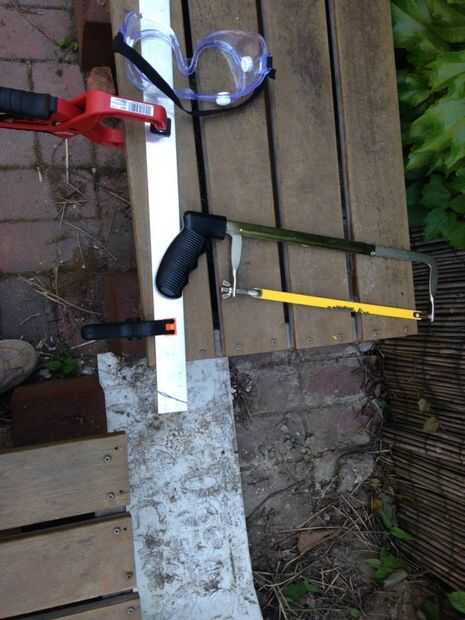 Corté las barras con mi sierra en un banco del exterior con poco las abrazaderas de plástico para mantenerlas en su lugar... y mi marido que se sentaron sobre ellos... en unos 30 minutos. Esta parte que definitivamente no pude haber hecho por mi cuenta porque sin alguien que las barras habría sido imposible a la sierra a través de ellos.