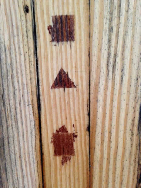 Entonces medí a los triángulos. Reglamento de bolos permite triángulos de a más 1 1/4" ancho de la base y 6" de largo (pero puede ser más pequeños que esto). La colocación de ellos son de cada madera 5 tiras y formar un triángulo de 7 en total que de arriba a abajo son unos 3'. Con todo esto en mente he averiguado dónde colocar cada triángulo y utilizado mi cinta de rana para crear plantillas.