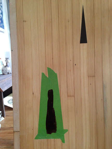 Me di cuenta que se supone poner algún barniz en primer lugar, de lo contrario la mancha sangra y utilizar cinta de pintor en lugar de una plantilla. Todavía no funcionaba (el triángulo pequeño en el mismo cuadro).